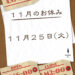 お知らせ 12月休業日のお知らせ 2025年11月30日 / 0件のコメント 〜12月休業日のお知らせ〜 12月7日(日曜日) 12月15日(月曜日) 12月22日(月曜日) 12月31日(水曜日) 上記期日は休業とさせて頂きます。 ※ 追加の際は随時ご案内致します。 宜しくお願い致します。