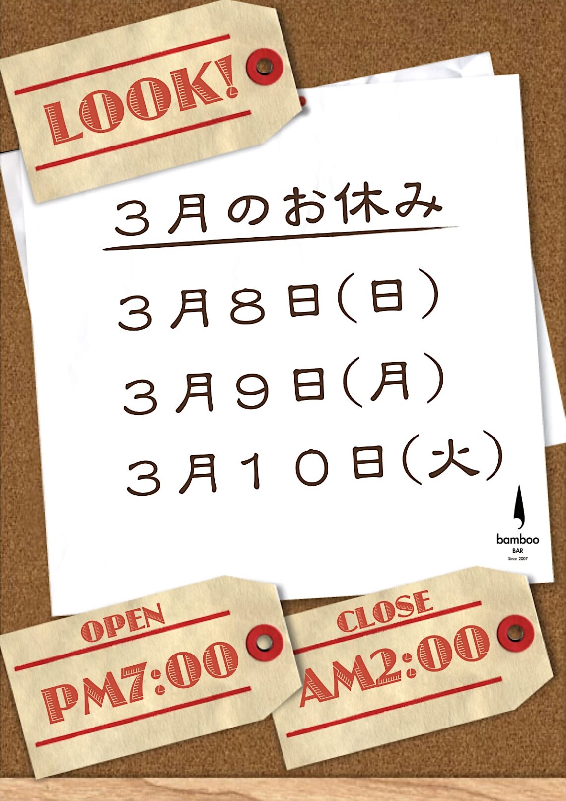 お知らせ 3月休業日のお知らせ 2026年2月21日 / 0件のコメント 〜3月休業日のお知らせ〜 3月8日(日曜日) 3月9日(月曜日) 3月10日(火曜日) 上記期日は休業とさせて頂きます。 ※ 追加の際は随時ご案内致します。 宜しくお願い致します。